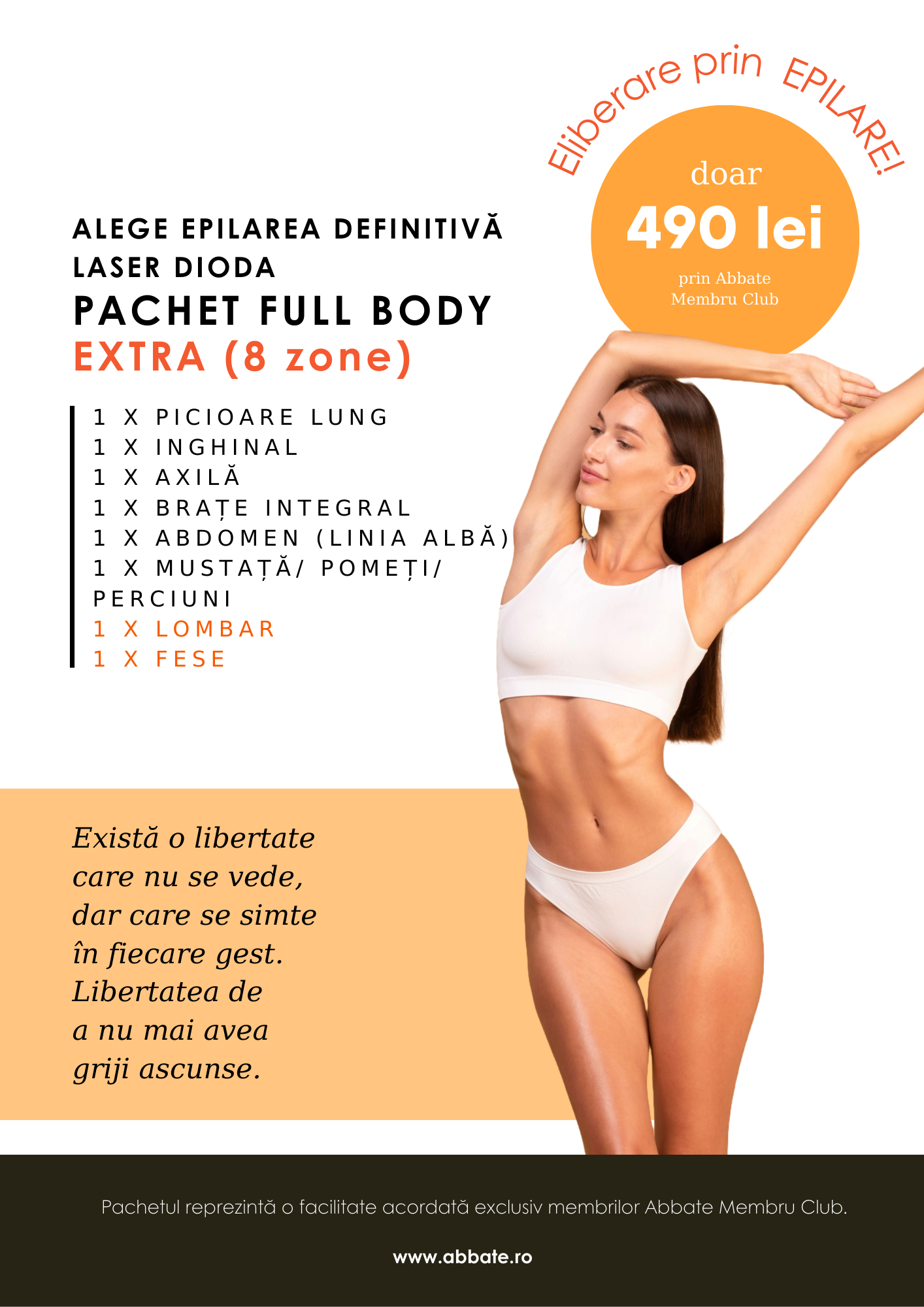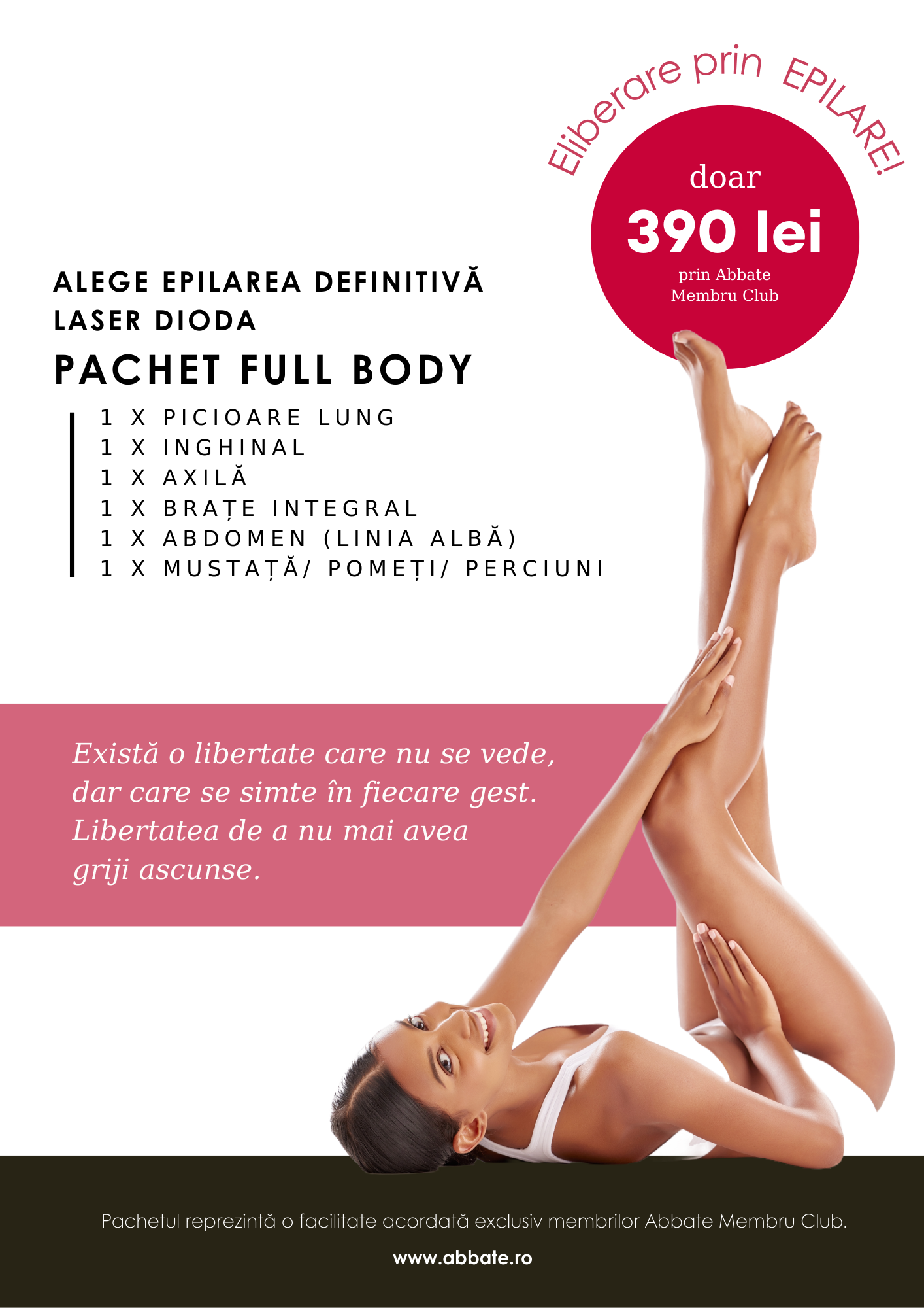 Profita de oferta de epilare definitiva laser dioda! Pachet FULL BODY cu 6 zone incluse, pentru ca, de acum, sa uiti de grija parului de pe corp!