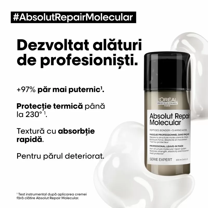 * Test instrumental după 15 aplicări ale gamei Absolut Repair Molecular (șampon + serum cu clătire + crema leave-in fară clătire). ** Test pe consumatori timp de 2 săptamâni de utilizare a gamei Absolut Repair Molecular (șampon + serum cu clătire + crema leave-in fară clătire). **** Test instrumental după aplicarea Absolut Repair Molecular crema leave-in fără clătire.