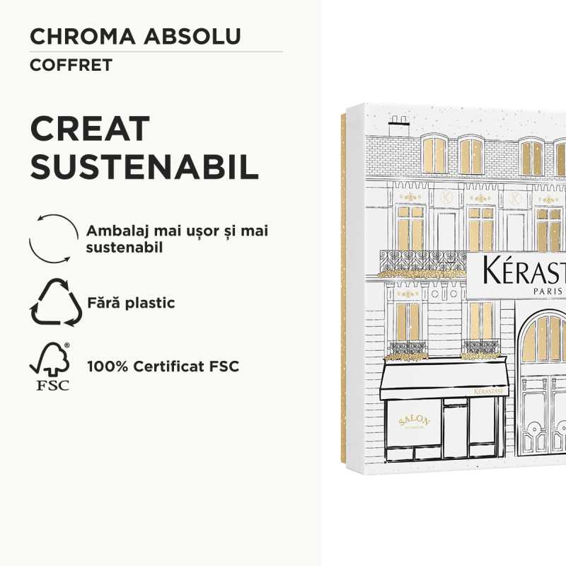 Bain Chroma Respect, 250ml Un sampon pentru protectia culorii cu Acid Lactic, pentru toate tipurile de par vopsit, fin spre mediu, care ofera o catifelare imediata si reduce electrizarea cauzata de vopsire. Fondant Cica Chroma, 200ml Un balsam care patrunde in profunzime, pentru fire de par mai puternice si reduce porozitatea fibrei pentru o culoare mai luminoasa si mai durabila. Sérum Chroma Thermique, 150ml Un serum fara clatire, anti-electrizare si antioxidant care protejeaza parul de caldura si lasa un aspect sanatos si stralucitor. Cand oferiti cadoul perfect, oferiti si un cadou sustenabil, deoarece fiecare cutie este: Ambalaj mai usor si mai sustenabil 100% Certificata FSC Fara plastic Este timpul sa te rasfeti cu ritualul suprem de ingrijire a parului si sa te tratezi pe tine si pe cei dragi cu colectia noastra exclusiva de seturi cadou pentru sarbatori.