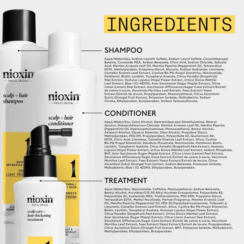 Nioxin System 1 este conceput pentru un par natural, netratat chimic, cu aspect usor subtiat. De asemenea, protejeaza parul impotriva caderii si ruperii, contribuind la intarirea si ingrosarea firului de par. Rutina in trei pasi incepe cu samponul, continua cu balsamul de par si cu tratamentul fara clatire pentru par System 1.