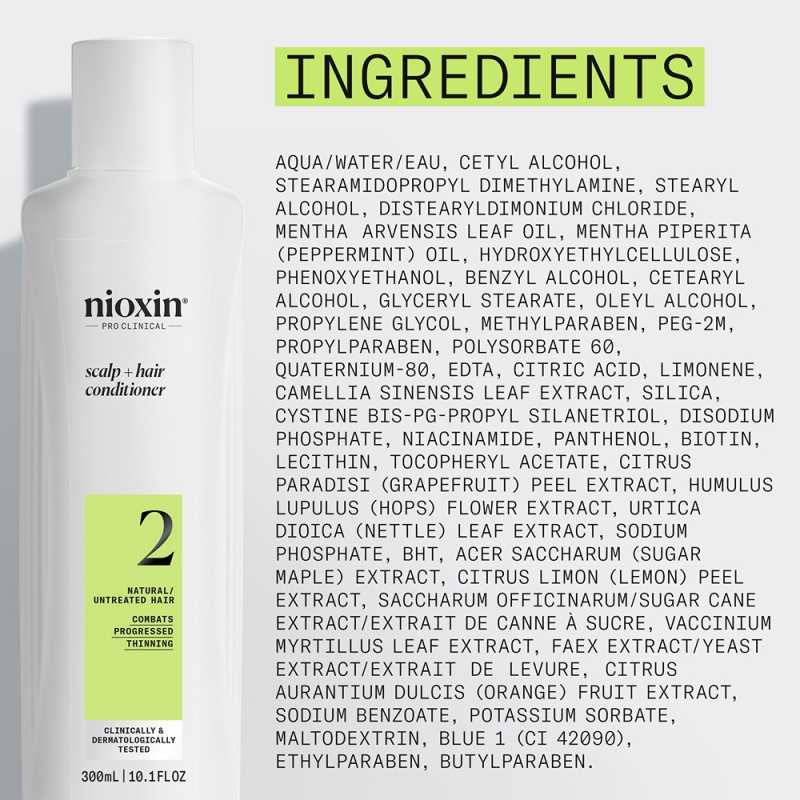 Nioxin System 2 este conceput pentru un par natural, netratat chimic, afectat de o subtiere avansata. De asemenea, protejeaza parul impotriva caderii puternice si ruperii, contribuind la intarirea si ingrosarea firului de par vizibil subtiat. Rutina in trei pasi incepe cu samponul, continua cu balsamul de par si cu tratamentul fara clatire pentru par System 2.
