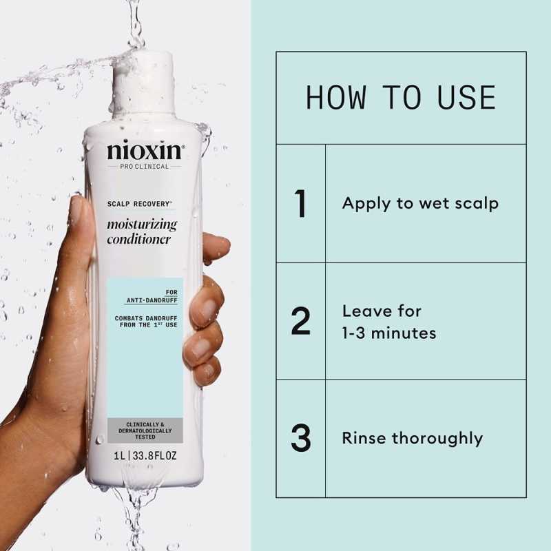Dupa samponarea cu samponul purificator Nioxin Scalp Recovery, aplica o cantitate generoasa de balsam de par Nioxin Scalp Recovery pe parul ud. Maseaza usor balsamul in scalp si par, insistand pe varfuri. Lasa-l sa actioneze timp de 1-3 minute pentru a permite ingredientelor hranitoare sa patrunda in firul de par, apoi clateste bine cu apa.