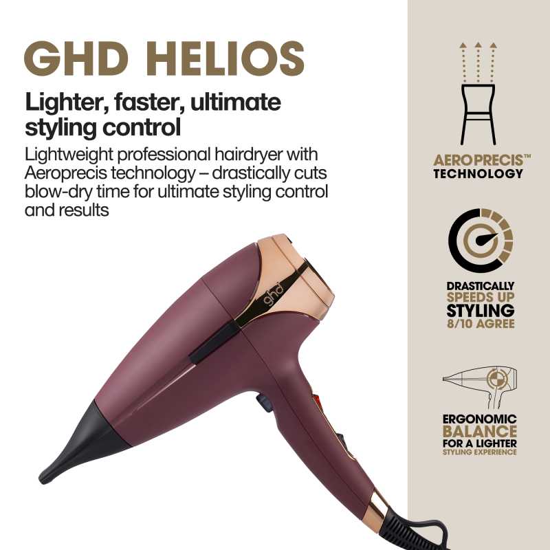 Uscatorul de par GHD Helios ofera control precis si reduce drastic timpul de uscare a parului, pentru rezultate profesionale rapide. Ultra-puternic, ofera cu 30% mai mult luciu (comparativ cu parul uscat natural) si coafare profesionala. Tehnologia Aeroprecis™ si duza speciala directioneaza fluxul de aer pentru un control perfect al styling-ului, pentru rezultate precise, ca la salon. Potrivit pentru toate tipurile de par, inclusiv parul texturat.